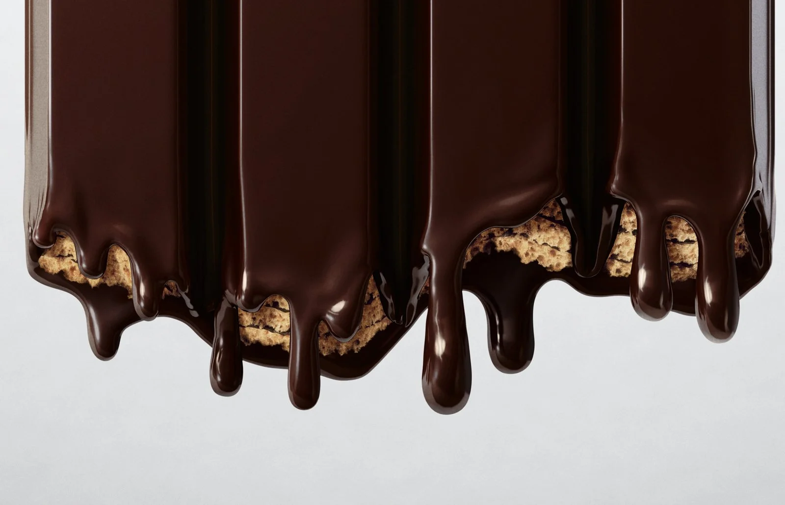 These images were a combination of CGI, photography & traditional model making. The wafer of the Kit Kat was created by a model maker & shot in house at EA. The melting chocolate was completely created in CGI. Yum.