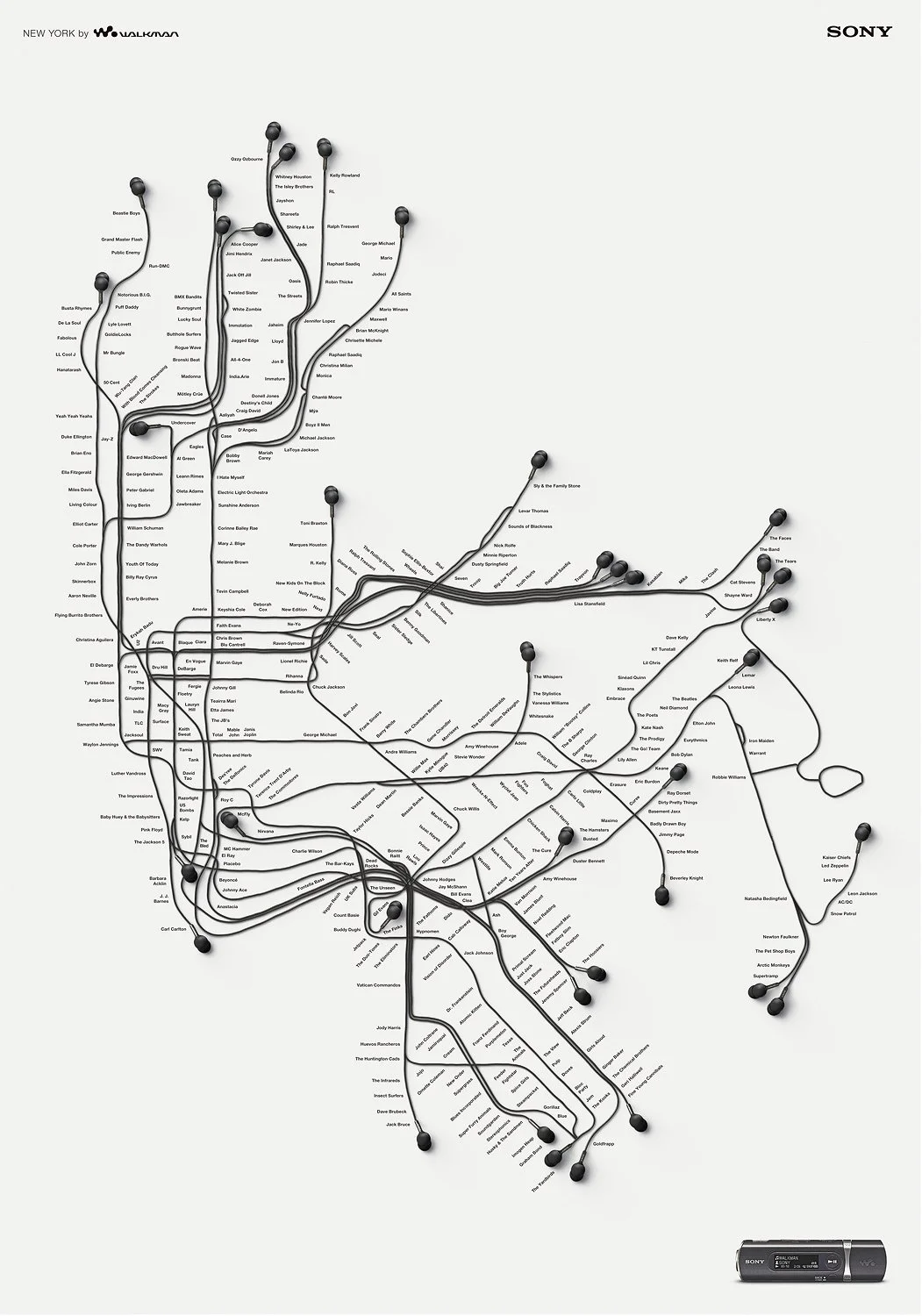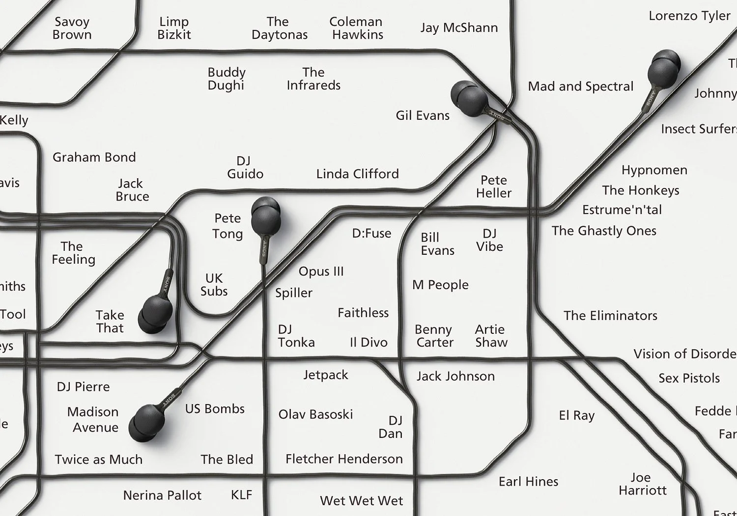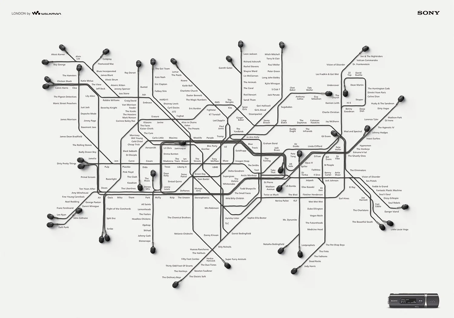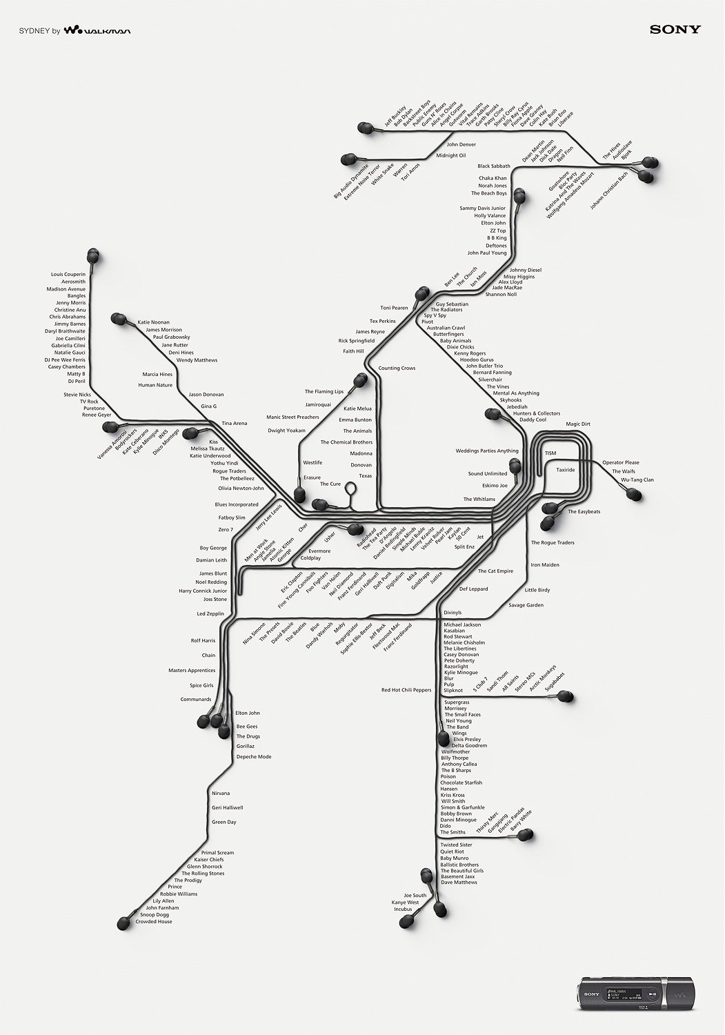 We recreated supplied vector artwork for the New York, London & Sydney metropolitan train network in CGI. The head phone cord & the ear piece itself was modeled from orthographic reference supplied. CGI enabled us to be very flexible with the layouts, we could change the rotation of the head phones & the length of the cords easily. The London image was a winner at the 2008 Caxton Awards.