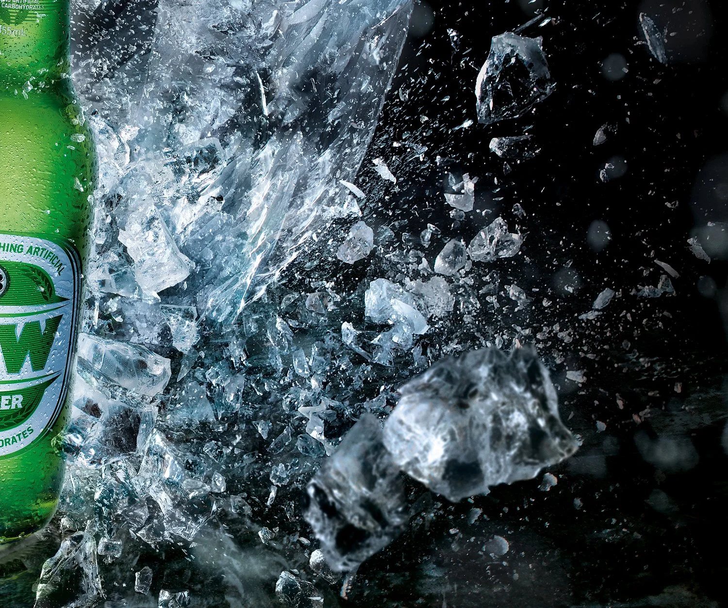 In order to create this image, an ice sculpture of a swan was made & then shot by Ian Butterworth in one piece & then shot again at various deconstructed stages. Individual chunks, smashes & sprays of ice were assembled with the bottle in post.